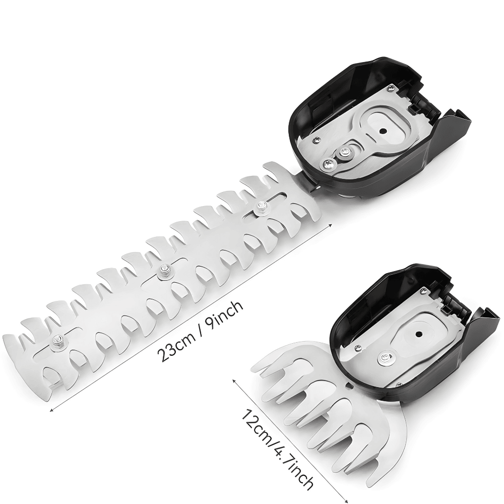 Paket sadrži: Trimer | 1 baterija | 1 sečivo za živu ogradu | 1 sečivo za travu | Punjač